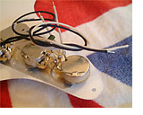 Vorverdrahtetes Pickguard mit Clothwiring, CTS 250K oder 250K reversed taper Pots (lefthand Drehrichtung), den Anschlüssen für die Federkralle und die Ausgangsbuchse